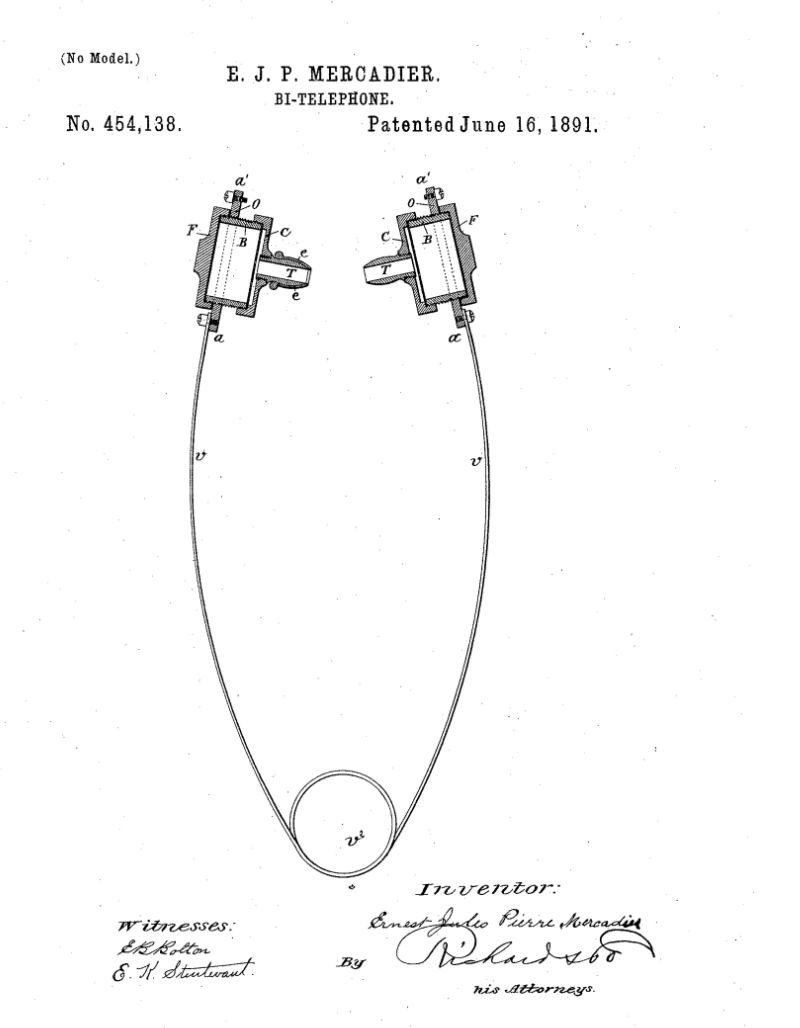似乎谁也没注意到一个叫 Ernest Mercadier 的法国工程师,在那一年默默提交了一个“电话接收器”的专利申请。这位老兄是这样描述他的发明的:「它有两个发声单元,以橡胶包裹……它足够轻便,单侧只有 1.75 盎司(49.61 克)……它可以很舒适地放入耳朵中,而解放电话员的双手。
