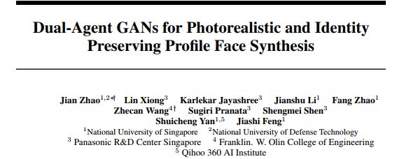 [3] J. Zhao, L. Xiong et al. Dual-Agent GANs for Photorealistic and Identity Preserving Profile Face Synthesis. NIPS 2017.