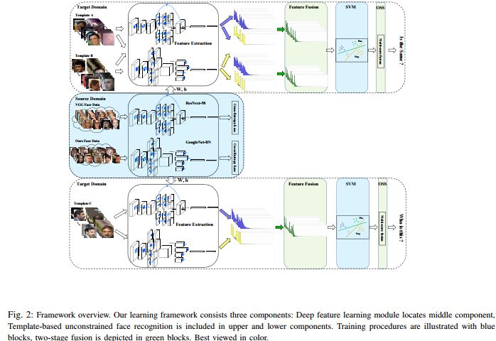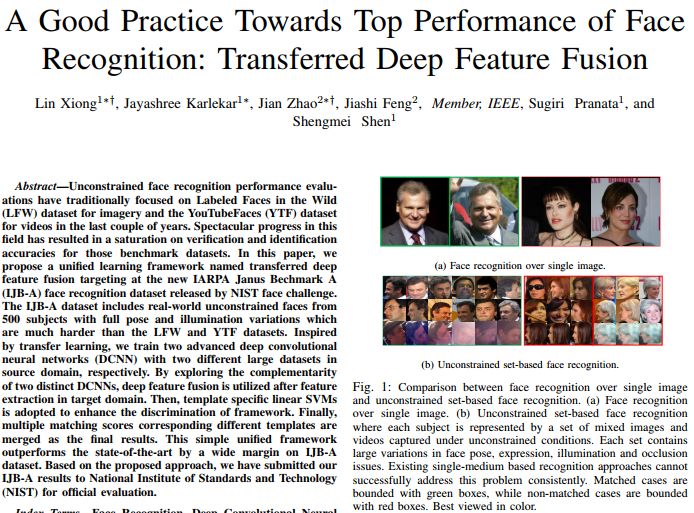 NIST 在2015年召开的CVPR上发布了IJB-A人脸验证与识别数据集,并同时拉开了围绕该数据集的人脸挑战赛的帷幕,我们于2016年10月正式决定参加该挑战赛并于2017年4月的NIST官方报告中,分别在验证1:1和识别1:N上都取得了第一的成绩,这不是仅仅依靠单个算法或模型所能做到的。我们的联合学习框架称之为迁移深度特征融合,具体可参见我们的arXiv预印版论文[1],我们的最新结果将在即将更新的arXiv预印版论文里展示。