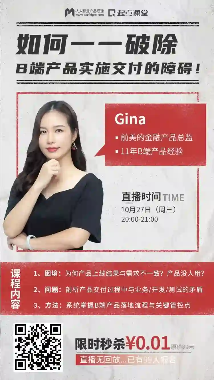 这是由起点课堂(原起点学院)出品的B端产品公开课,专为正在做B端产品同学,或者对B端产品感兴趣想要了解相关工作内容的同学打造,课程将由前美的金融产品总监@Gina老师直播授课。