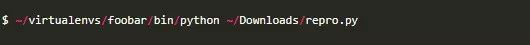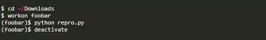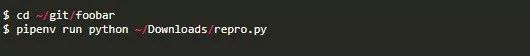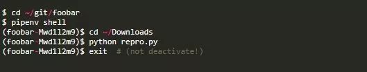 Pipenv的另一个问题是使用工作目录来选择虚拟环境。[3]假设我是图书馆的作者。我的foobar库的一个用户刚刚报告了一个bug,并附上了一个repro.py文件让我重现这个问题。我将该文件下载到我的文件系统上的~/Download目录。用普通的旧虚拟器可以很容易地用以下语句在备用外壳中重现: