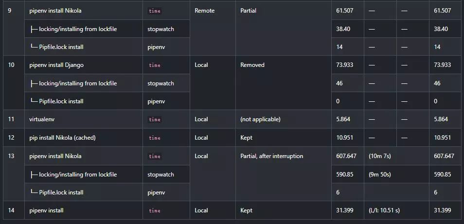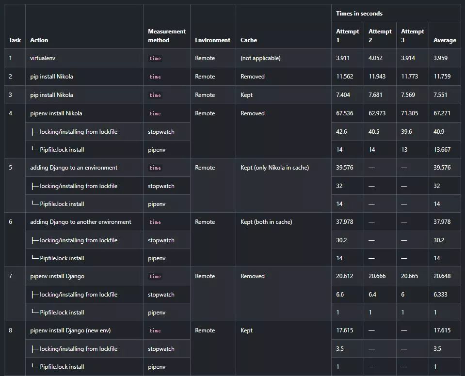 (更新于2018-07-22:在Pipenv测量中:第一项是Pipenv可执行的总时间。第二项是等待Pipenv完成其“主要”任务:锁定依赖项并安装它们。计时在Pipenv开始锁定依赖项时开始,在提示符出现时结束。第三项是Pipenv报告的安装时间。因此,Pipenv安装时间⊇锁定/安装时间⊇Pipfile.lock安装时间。)