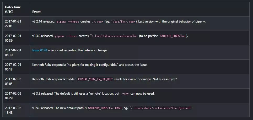 在好几个月期间Pipenv的README文档中常常有上面那句口号:这句口号是2017-08-31加进去README文档里的,最终在2018-05-19被删除。有那么一阵子(在2018-05-16),有说明(管理应用程序依赖,还有Pypa而非Python.org),而在约15分钟的时间里,这句口号变成了“Pipenv是世界上最烂的”或其他大概是这个意思的话(这是维护者的吐槽)。