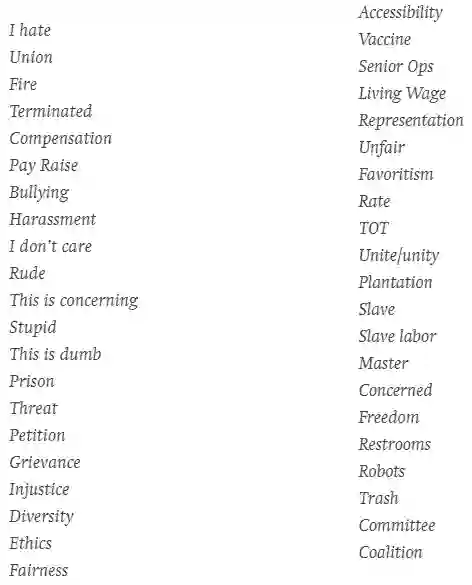 从名单中可以看出,不仅“我讨厌”、“不公平”、“工会”、“洗手间”这类关键词会被锁定、“这很蠢”和“这令人担忧”等这类常用短语也会被阻止。除了自动化监控,The Intercept 表示其管理人员还将有权手动标记或禁止他们认为不合适的任何帖子。