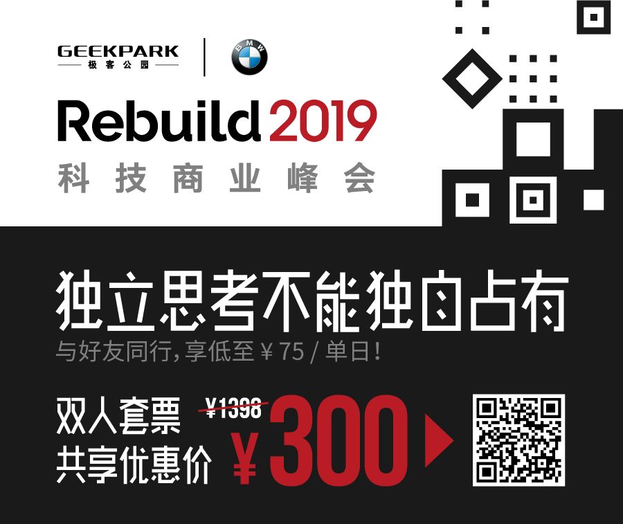 2019 年 5 月 24 日 - 25 日,GeekPark Rebuild 2019 科技商业峰会空降成都·中国西部国际博览城,重磅嘉宾陆续更新中,立即扫描下方二维码或点击「阅读全文」购买 Rebuild 2019 门票,亲临现场!