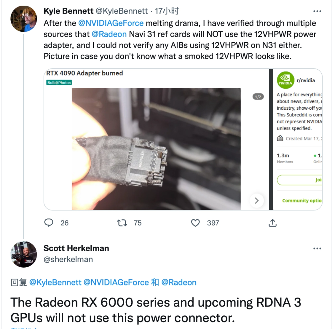 在英伟达 RTX 4090 显卡上的 16pin(12VHPWR)供电连接器出现烧毁事件后,AMD 的 Scott Herkelman 在回应网友的评论中确认 RX 6000 和即将到来的 RX 7000 系列显卡都不会采用这种接口。根据之前的爆料消息,AMD 新款基于 Navi 3X GPU 的公版显卡将仍使用双 8pin 电源连接器。高端非公版可能会使用三 8pin 电源连接器。