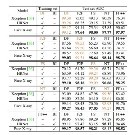 而 Face X-Ray 只在其中一种算法(例如 DeepFakes)合成的图像上训练,然后再在另外三种数据上测试,测试结果都可以达到95%以上的识别率。这在“通用”换脸鉴别算法中,无疑是一大创新突破。