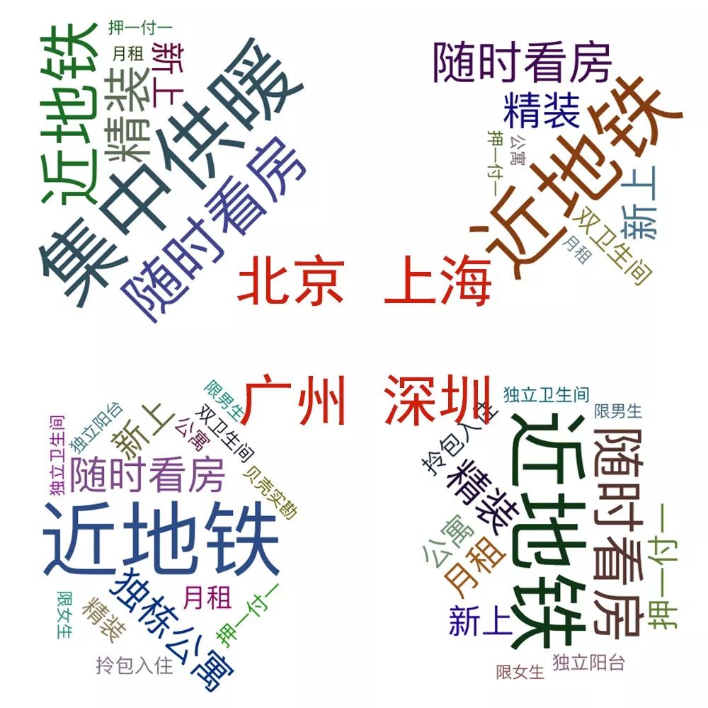 最后,我们对每个房源的标签进行了统计,并且绘制了词云图,可以看出各城市租房时思考的侧重点。