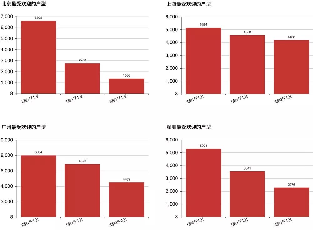 可见,北上广都偏爱2室1厅1卫的房子,而深圳却是1室0厅1卫的房子最多,看来,在深圳奋斗的人,能住带厅的房子已经不容易了。不过四个城市都是小户型出租的居多。
