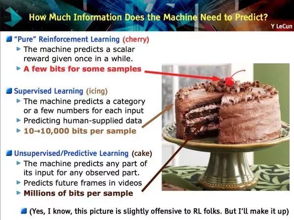 单纯的增强学习(樱桃)——一些样本中的一些Bit;监督学习(刨冰)——每个样本10-10000Bit;无监督学习(蛋糕)——每个样本百万Bit