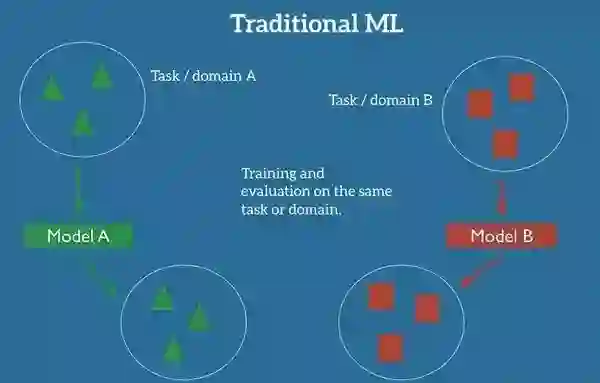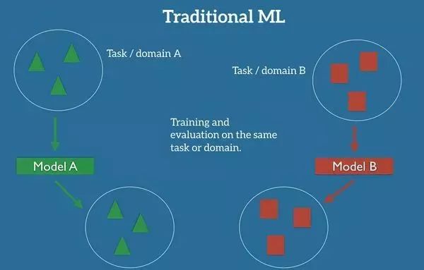 注解:Traditional ML:传统机器学习,Task/Domain: 任务/域, Model: 模型,Training and evaluation on the same task or domain: 在同一任务或域下训练和验证模型。