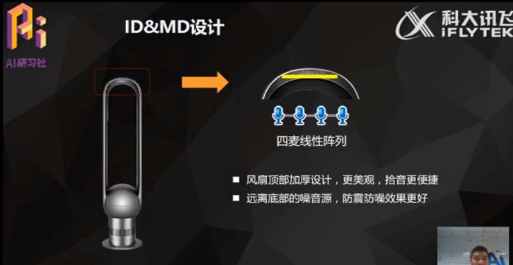 影响声学效果的主要因素,包括麦克风阵列的构型,孔径,孔深,开孔率,声腔的密闭性以及防震防水等,比如图中的无叶风扇,当我们确定了在顶部采用四麦阵列方案之后,就需要考虑如何对这个方案进行优化,对此产品上进行了两点处理:1,在风扇顶部加厚处理,这样可使风扇整体更美观,顶部加厚处理还有助于开孔和加大开孔率,麦克风拾音也更便捷。2,考虑到底部为风扇电机的噪音源,因此将麦克风置于顶部。