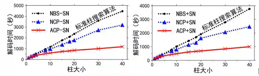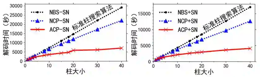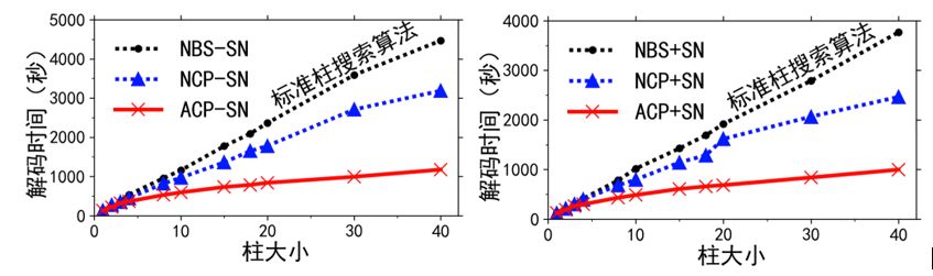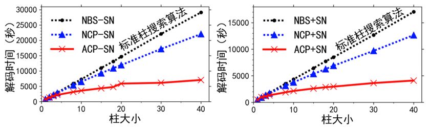 从上面两个图可以看出,在不考虑质量的情况下,当柱大小为40时,ACP+SN加速解码器3.8倍。