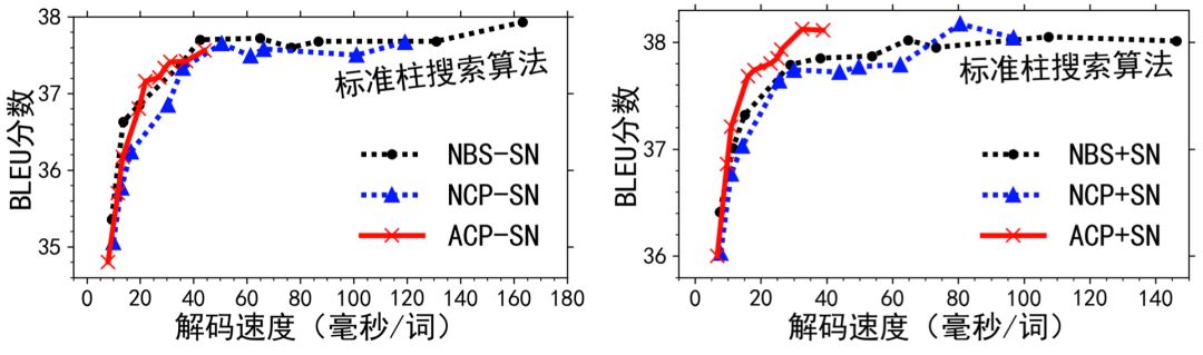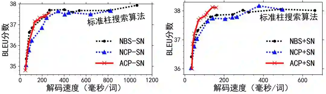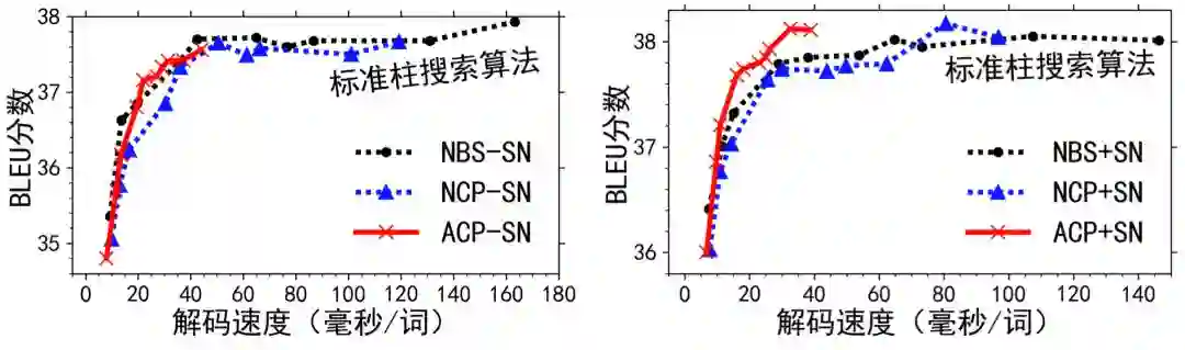 左图中,不使用自归一操作时,ACP显著加快了解码,不过损失了0.5个BLEU值。