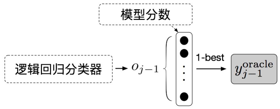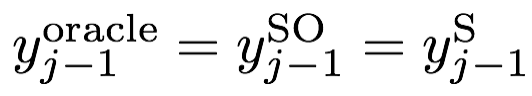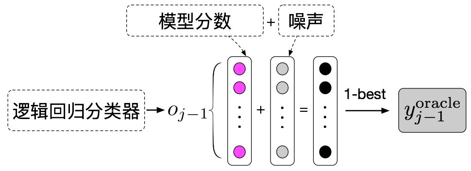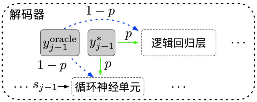 NMT训练时仅使用前一步的参考词语做预测,我们引入模型本身预测的词语,结合参考词语。模型自身输出的词语称为1-best词语,1-best词语包括词级候选(Word-level Oracle,简称WO)和句级候选(Sentence-level Oracle,简称SO)。在训练过程中,我们在参考译文词语和1-best词语之间进行伯努利采样,即以概率p采样参考词语,以1-p的概率采样1-best词语。整个过程的示意图如下所示: