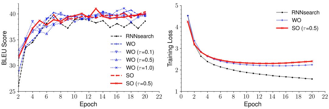 我们使用开发集上BLEU最高的模型进行测试,从上面左图可以看出,RNNsearch模型在第7轮达到最好的BLEU值。但右图中训练集上的loss依然在降,我们认为这是基线模型所存在的训练过拟合问题,我们使用提出的采样方法和冈贝尔噪声虽然收敛慢,但可以缓解过拟合问题。