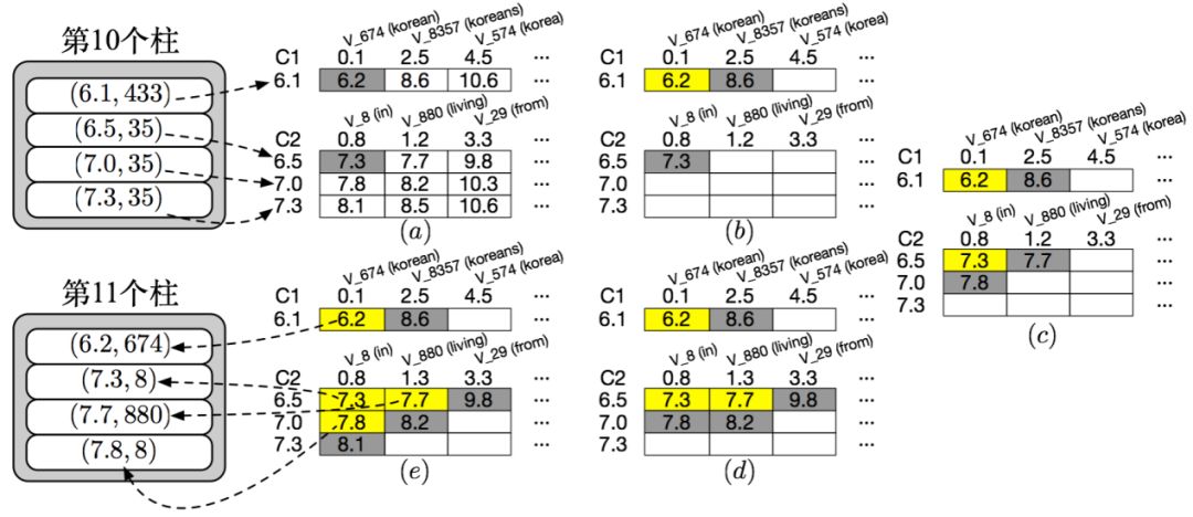 上图展示了立方剪枝搜索算法从第10个柱生成第11个柱的全过程。下面我们对上图进行详细的剖析。为了画图和解释方便,对于柱中每一个存储单元块,我们只在图中记录累积的Negative Log Likelihood (NLL)值和目标端候选词语在词汇表中的索引,例如图中第10个柱中第一个块(6.1,433)中的6.1表示截止到第10步解码序列上累积的NLL值,433表示当前候选词语在目标端词汇表中的索引。假设柱大小为4。为当第10步初始化一个堆之后,我们首先按照目标端词语相同的约束条件将第10个柱中所有块合并同类项,得到两个块组C1和C2,如图中的(a)部分所示,(6.1,433)组成块组C1;(6.5,35)、(7.0,35)和(7.3,35)具有相同的目标端词语35,合并在一起构成另一个块组C2。对于每个组块,我们使用所有块中包含隐状态的按元素平均值作为该组块隐状态向量的近似值,估计下一个步的概率分布和隐状态。合并同类项和做完近似化概率分布扩展之后,每一个组块里所有的块在两个维度均是按照NLL降序排序,如(a)子图所示。然后,每个组块中的左上角的块被推入到最小堆(在从左上向右下的搜索过程中,我们每次向最小堆中推入一个候选项时,最小堆都会根据NLL值将堆中最优的候选(NLL最小的候选)放置在根结点中)中,在从堆中弹出NLL最小的块之后,我们计算并存储该块的精确NLL,然后将组块内位于该块右边和下边的块(如果有的话)再推到最小堆中。结合图中所有步骤说明如下: