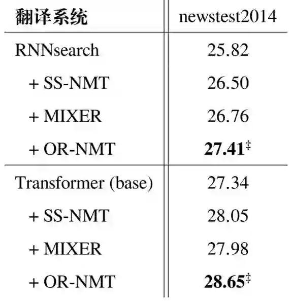 3. NMT模型大多是自回归的,即以源语言句子和目标端的历史序列作为条件逐词生成整个目标译文。在训练阶段,模型以目标端参考译文的历史序列作为上下文进行预测;而在测试阶段,模型必须从头开始生成整个序列,不得不使用自身预测出来的历史序列作为上下文预测下一个词。这种训练和测试输入上下文词汇的差异会不断地导致错误累积。此外,词级的训练过程要求所生成的序列与参考译文序列之间严格匹配,这导致对不同但合理的翻译的过度校正。