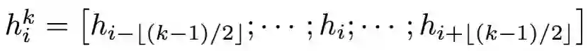 将编码器的输出序列当作对象序列,对于其中每一个词语表示,窗口大小为k的输入为