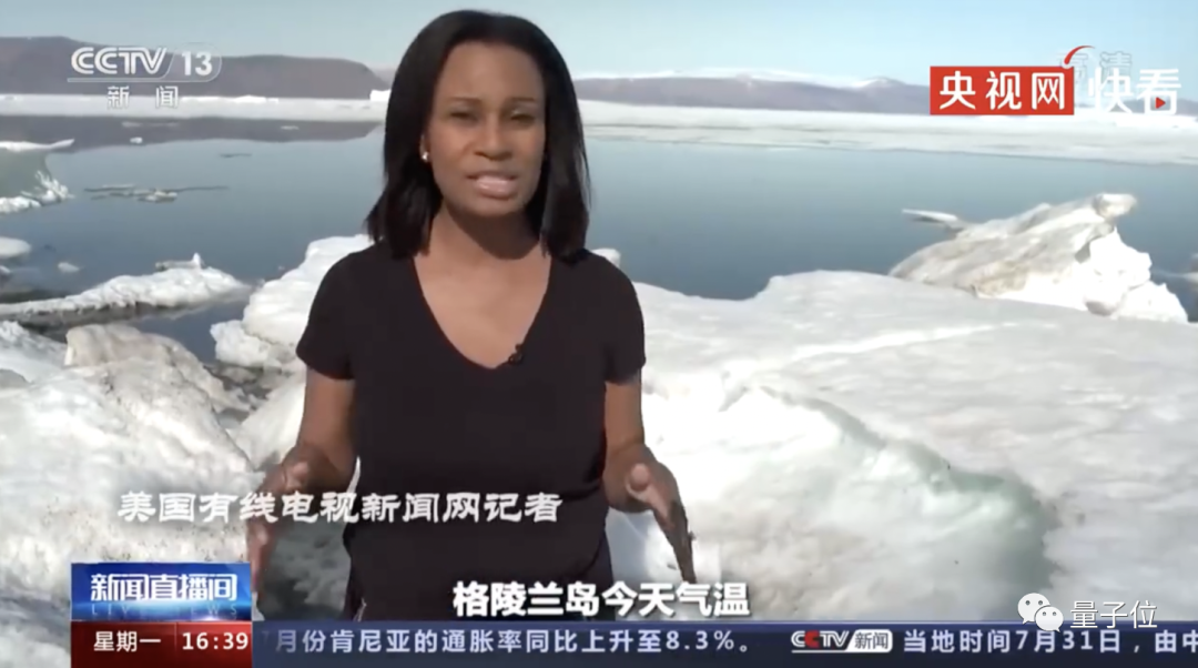 画面中,国外记者(CNN)虽站在格陵兰岛、背靠冰雪,但却身着一件单薄的T恤,并且还表示: