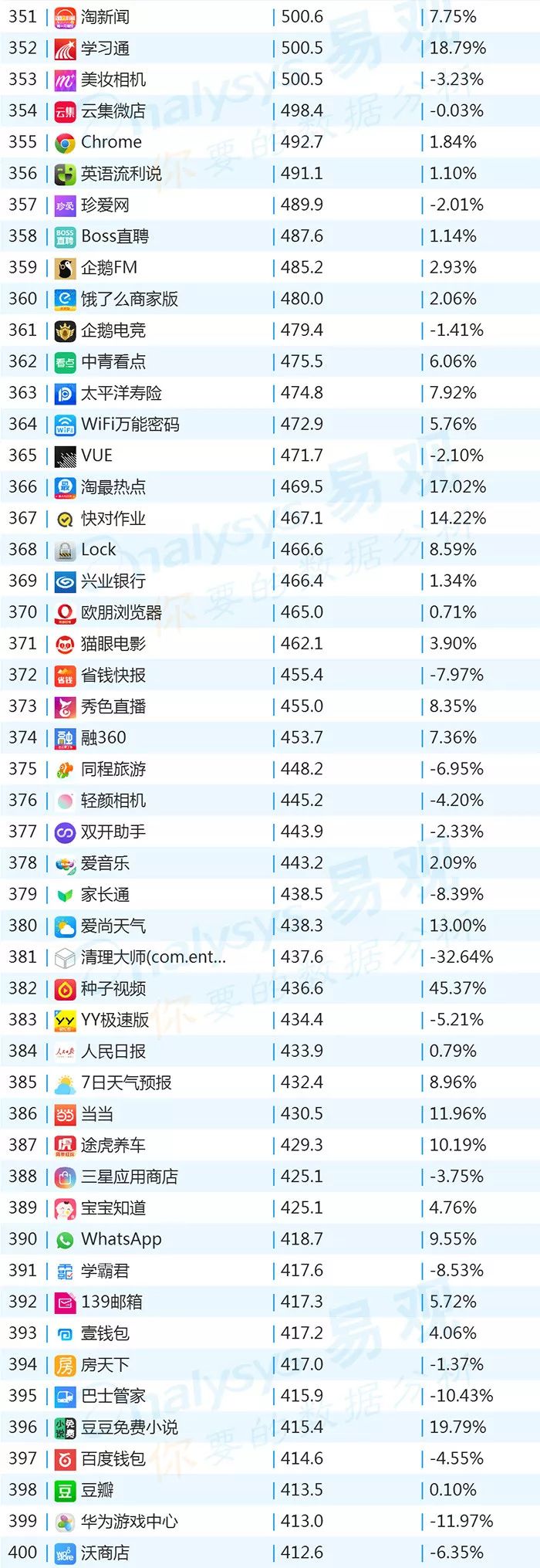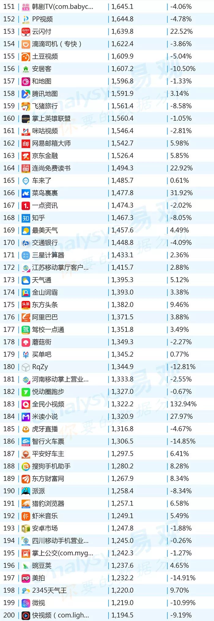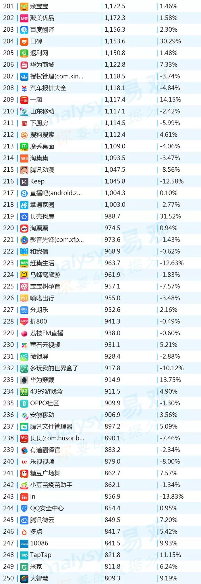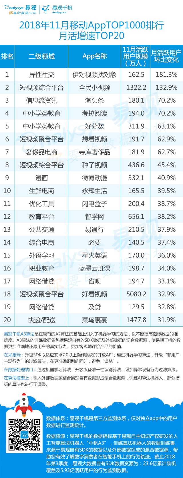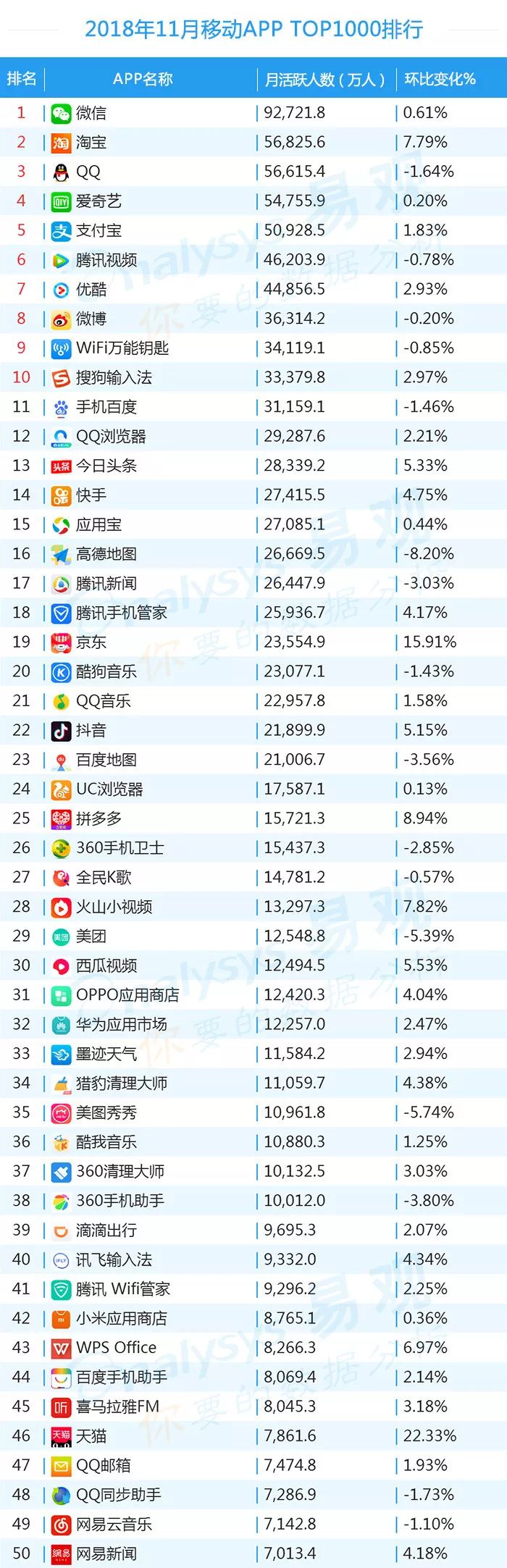 双11的“发起人”阿里,其旗下产品可谓在该月赚足了风头,尤其是淘宝可以说是当之无愧的最大赢家。其在TOP1000榜单排名中,淘宝由10月的第四名一跃成为榜单第二名,月活规模超过了QQ和爱奇艺,表现亮眼。