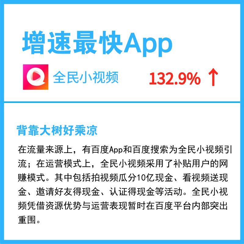 除全民小视频11月表现亮眼外,好看视频也取得了不错的成绩,其采用“收徒赚钱”和“邀请小技巧”的用户裂变推广方式,鼓励用户拉新,提升拉新成功率。11月,好看视频月活跃用户规模达5080.2万,环比增长32.9%,持续保持高速增长趋势。