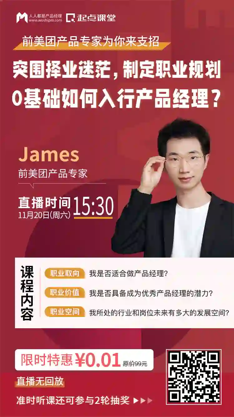 由此,我们特邀前美团产品专家@James授课。来跟大家讲解如何做好系统而专业的产品经理职业发展规划,以帮助新人们更好地认识自己和产品岗,规划好自己的产品进阶路线。