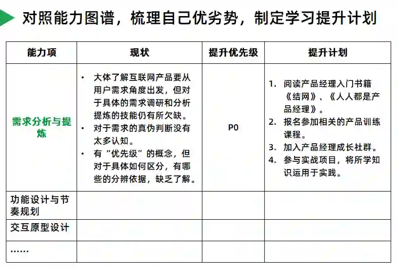 2)产品人要时刻审视自己的一点是:我能不能建立自己更多的不可替代性,建立自己的壁垒,在本次课程中,老师将会教授大家如何按照能力图谱,制定适合自己的提升计划,建立自己的不可替代性。