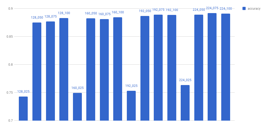 在 alpha 达到 0.25 时,准确性开始急速下降。准确性随着 alpha 的值和图像尺寸呈线性下降。所以,我们不使用 alpha 0.25 这个值。