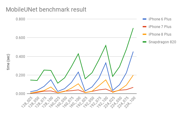 因此,如果你想要发布基于移动设备的深度学习应用,最好先在主流的设备上做一下测试。接下来,我要分享一下 MobileUNet 的各种指标。
