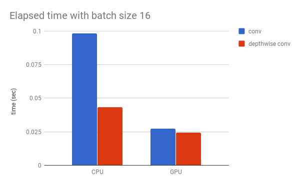 深度卷积块和普通卷积块在 CPU 上的表现差别很大,但在 GPU 上的差别却小了很多。