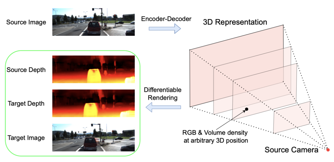 。MINE 通过对单张图片做三维重建,实现新视角合成和深度估算。通过引入隐式神经场(NeRF),研究者将 Multiplane Images (MPI)扩展成连续的深度平面。给定单个图片作为输入,MINE 能在相机视锥中的任意深度,预测出一个四通道的图像,四通道包括 RGB 颜色和空间密度。这种任意深度的四通道预测,实际上是对输入图片的视锥的三维重建,以及对被遮挡内容的填充(inpainting)。我们可以利用被重建和填充的视锥方便地渲染出新视角下的 RGB 图片和深度图,并且渲染过程是可导的。