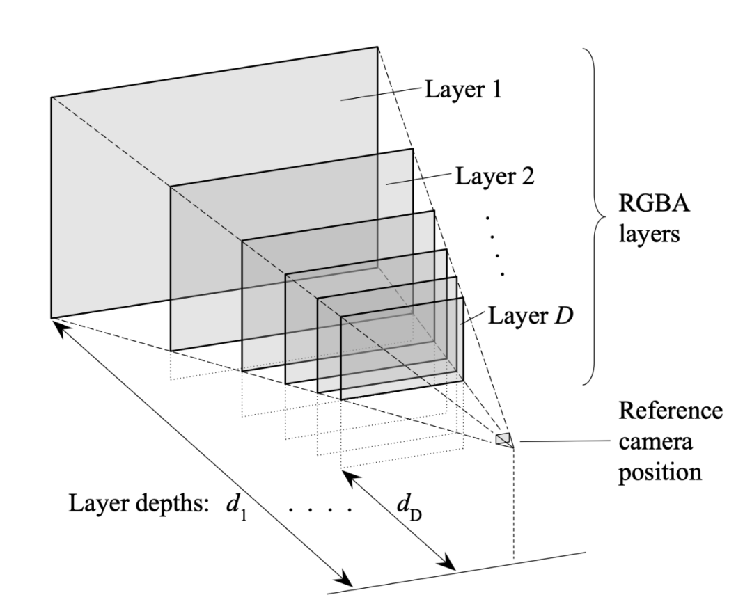 另外一个与该研究较相关的是 MPI(Multiplane Image)[1, 2, 3]。MPI 包含了多个平面的 RGB-alpha 图片,其中每个平面表达场景在某个深度中的内容,它的主要缺点在于深度是固定及离散的,这个缺点限制了它对三维空间的表达能力。[1, 2, 3] 都能方便地泛化到不同的场景,然而 MPI 各个平面的深度是固定且离散的,这个缺点严重限制了它的效果。
