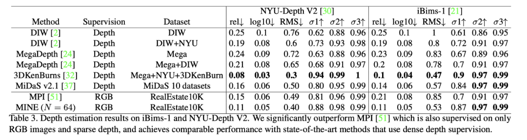 利用在 RealEstate10K 上训练的模型,在 NYU 以及 iBims-1 数据集上测试了单目深度估计的结果。虽然只有 RGB 和 sparse 深度监督,但 MINE 在单目深度估计任务上取得了非常接近全监督的 3DKenBurns 的性能,并大幅超越了其他弱监督的方法。其中,和 MPI 相比,此方法更不受图片 texture 的影响,在 texture 丰富的区域依然能生成平滑的深度图。