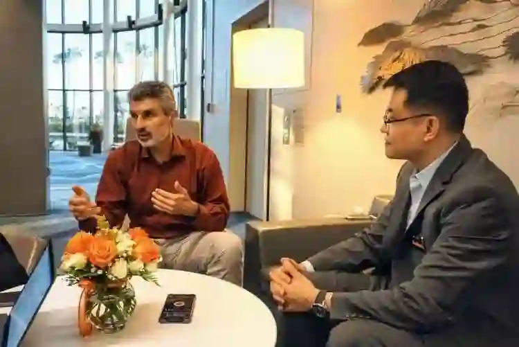 ▲约书亚·本吉奥和滴滴出行科技合作总监吴国斌接受采访。Image Credit: 杜晨/硅星人
