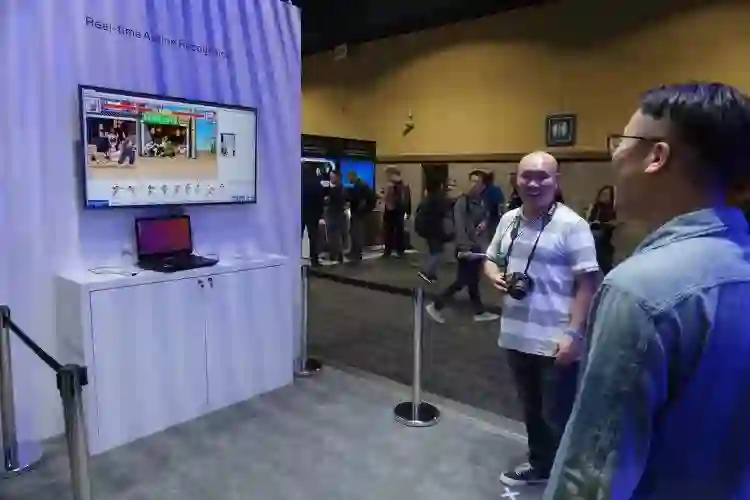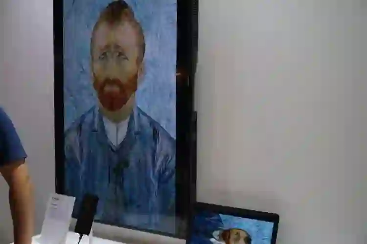 ▲商汤科技的展示也颇具创意:摄像头捕捉体验者的面部,显示屏上的梵高自画像会跟着改变表情。