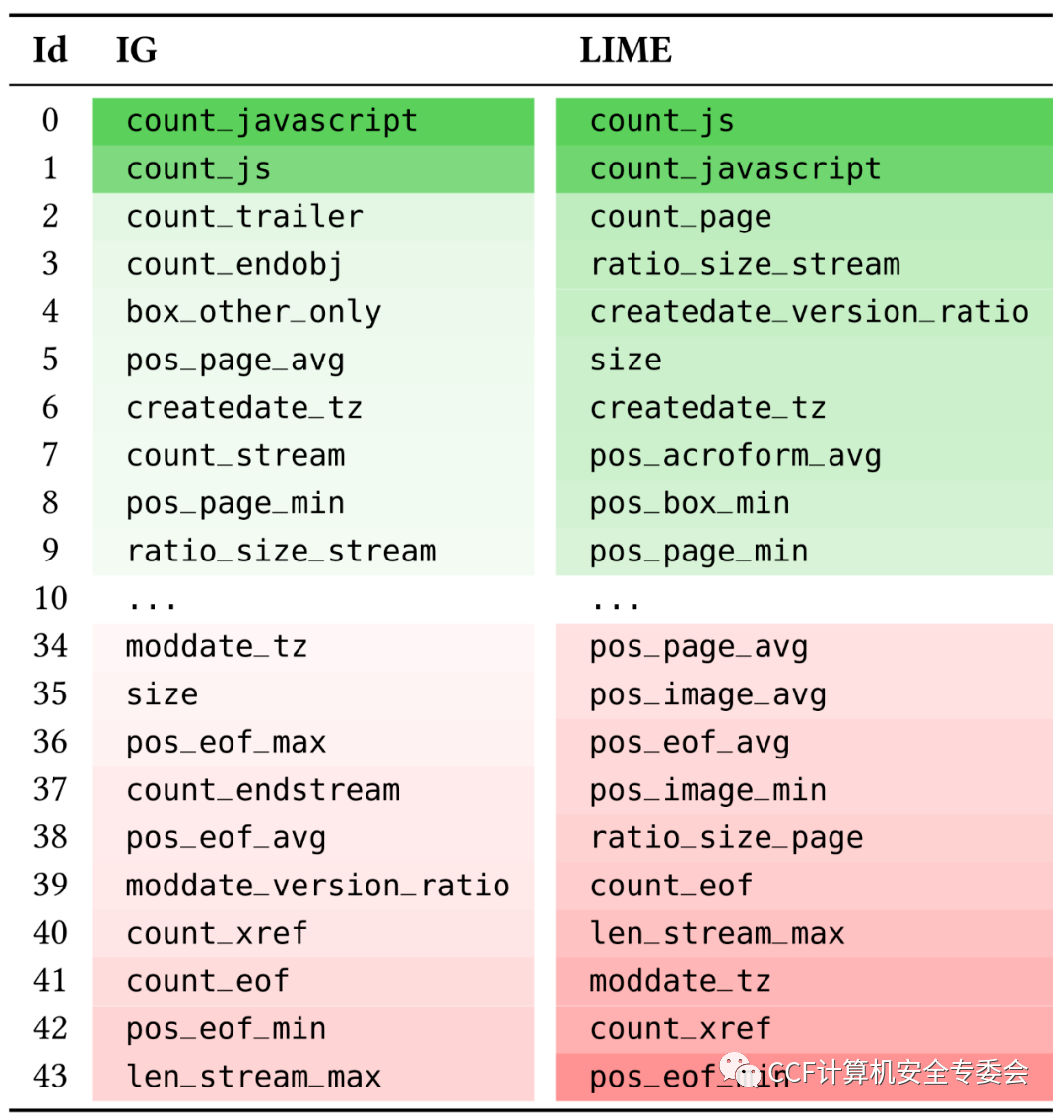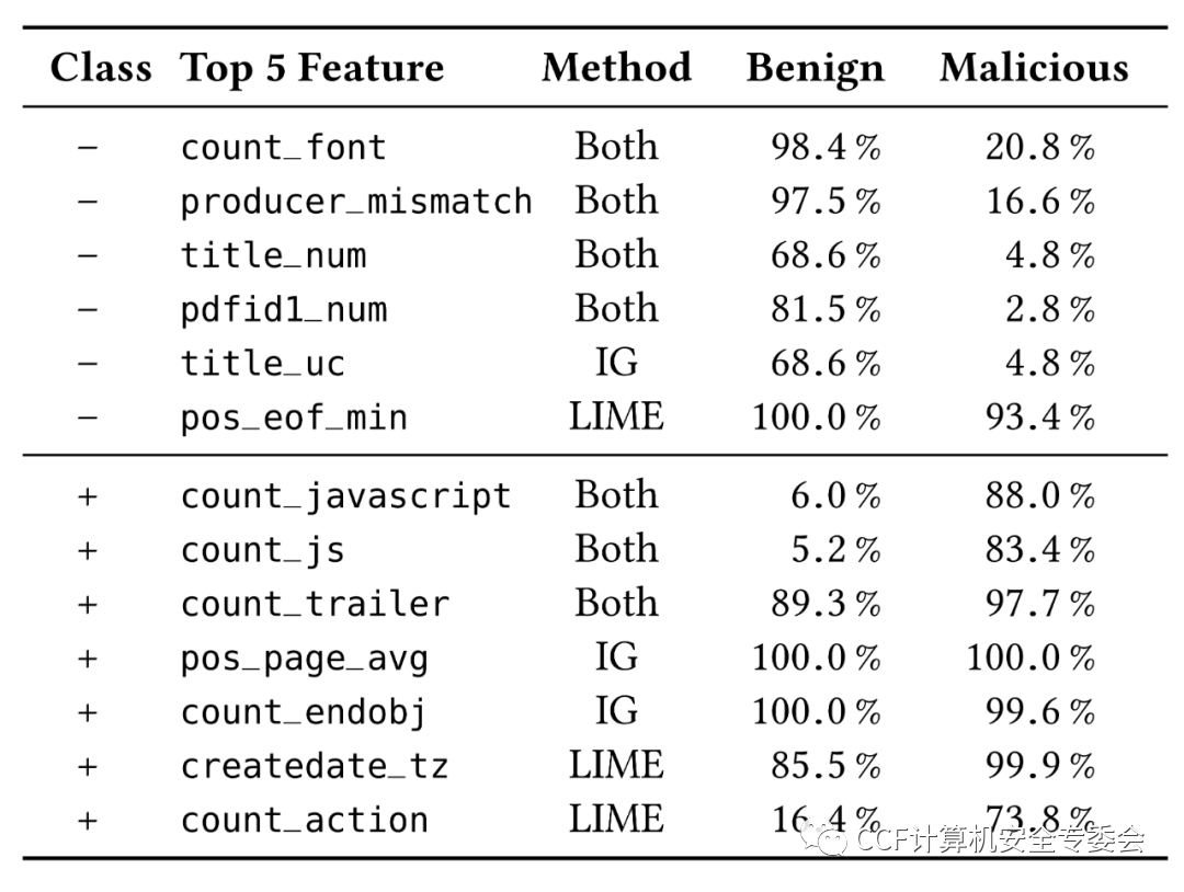 表3. 使用IG和LIME为Mimicus+预测的恶意PDF文档进行解释。