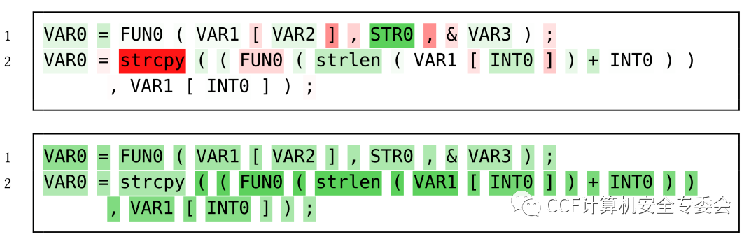 图2. 使用白盒(上)和黑盒(下)方法对VulDeePecker系统的决策进行解释。