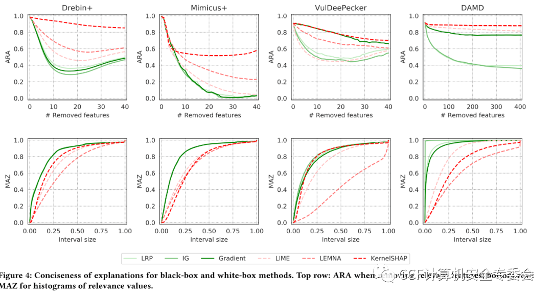 如图1所示,通过计算曲线下面积(AUC)可知,白盒解释方法的简洁性平均比黑盒方法高30%,且白盒方法的效果总是接近甚至优于Brute-force方法。在稀疏性方面,白盒解释方法的稀疏度比黑盒方法高19%,白盒方法为更多特征分配了接近于零的值,而黑盒解释方法给出的特征的相关性值在零附近的分布更广,从而使MAZ的斜率更小,接近于0。此外,该论文也对解释方法的完整性和效率进行了评估。白盒方法在四个安全系统中均适用,而黑盒方法则存在受到限制和无法给出有意义结果的情况。白盒方法比Brute-force方法快得多,黑盒则与之效率较为接近。计算四个指标的平均值可以系统性地比较上述6种方法(表2),可知只有白盒解释方法在所有的指标中都被评为了“强”的等级。