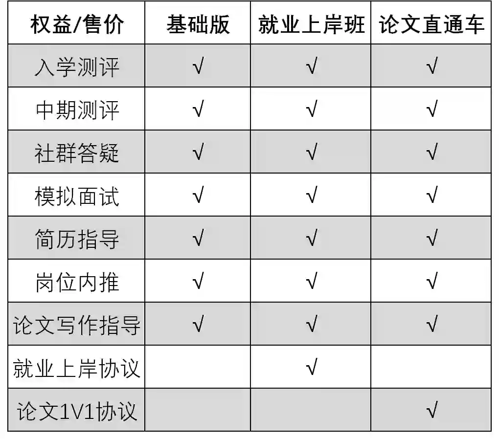 CV工业项目班分为基础版、就业上岸班和论文直通车3种版本。同学们可以根据自己的实际需求选择对应的服务。