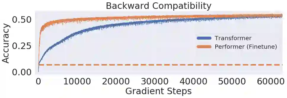 我们进一步证明了,通过使用我们提出的无偏置近似 softmax 函数, Performer 模型在稍微进行微调之后可以向后兼容预训练的 Transformer 模型,从而有可能在提升推理速度的同时降低能耗,并且不需要对现有的预训练模型重新训练。