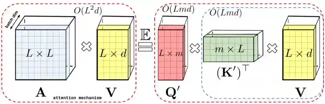 在最初的注意力机制中,分别对应矩阵行与列的 query 和 key 输入会进行相乘,然后通过 softmax 运算形成一个注意力矩阵,用来存储相似性得分。值得注意的是,虽然在这种方法中,将 query-key 的乘积传递给非线性 softmax 运算后,便无法再将其分解为最初的 query 和 key。但是它可以将注意力矩阵分解为一个将原始 query 和 key 作为输入的随机非线性函数的乘积,也被称作随机特征,这样就可以更加高效地对相似性信息进行编码。