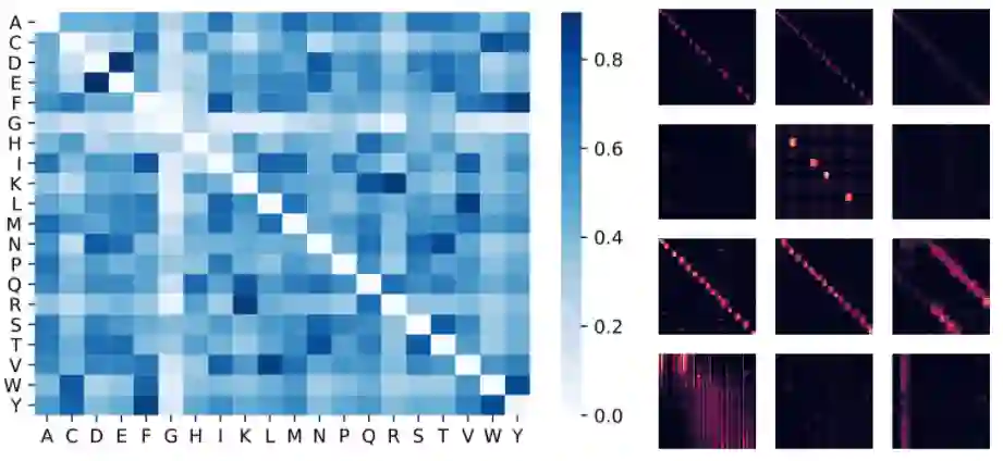 左侧:使用注意力权重估计的氨基酸相似性矩阵。在仅访问了蛋白质序列且无需事先了解生物化学信息的情况下,该模型可以识别高度相似的氨基酸对,例如 (D,E) 和 (F,Y)。中间:通过 BPT1_BOVIN 蛋白质的 4 层(行)和 3 个选定的头(列)建立的注意力矩阵,显示了局部和全局注意力模式