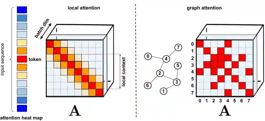 标准稀疏化技术,左侧:稀疏模式示例,其中 token 仅注意其他邻近的 token;右侧:在图注意力网络中,token 仅注意图中的邻近 token,该 token 的相关性应高于其他节点。请参阅 Efficient Transformers: A Survey,全面了解各种不同类别的方法