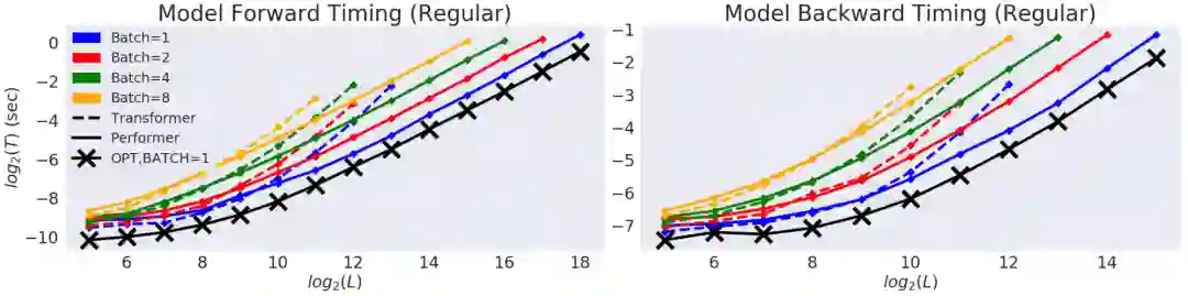 我们首先对 Performer 的空间和时间复杂度进行了基准测试,其结果表明,注意力计算的加速和内存占用的减少在实践中近乎达到最优的效果,也就是说,非常接近在模型中完全不使用注意力机制的性能。