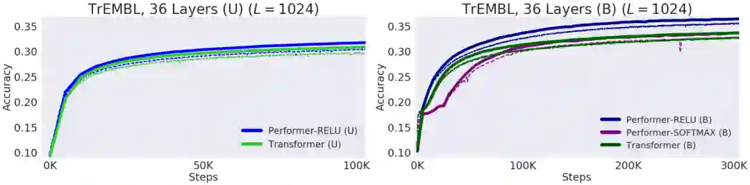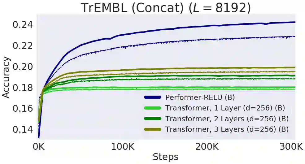 蛋白质是具有复杂 3D 结构的大分子,拥有生命必不可少的特定功能。和单词一样,我们也可以将蛋白质指定为线性序列,其中每个字符代表 20 个氨基酸基本模块之一。将 Transformer 应用于大型未标记的蛋白质序列语料库(例如 UniRef)后,其生成的模型可用于精确预测已折叠的功能大分子。Performer-ReLU(使用基于 ReLU 的注意力机制,这是与 softmax 不同的广义注意力机制实例)在蛋白质序列数据建模方面表现良好,而 Performer-Softmax 的性能可以与 Transformer 相媲美,这与我们的研究理论结果所预测的一致。