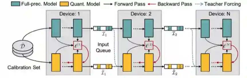 与逐个模块化重构量化误差不同,后量化还可以并行化训练。研究者把每个切分后的模块可以放在不同的 GPU 上,在不同模块之间设置输入缓冲池(input queue)