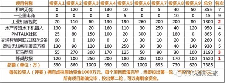 各位评委给出的虚拟“投资额”如下:(注,正好投完1000万的是TCL创客空间的邹宇和润加速的权泉两位评委,不得不服!)