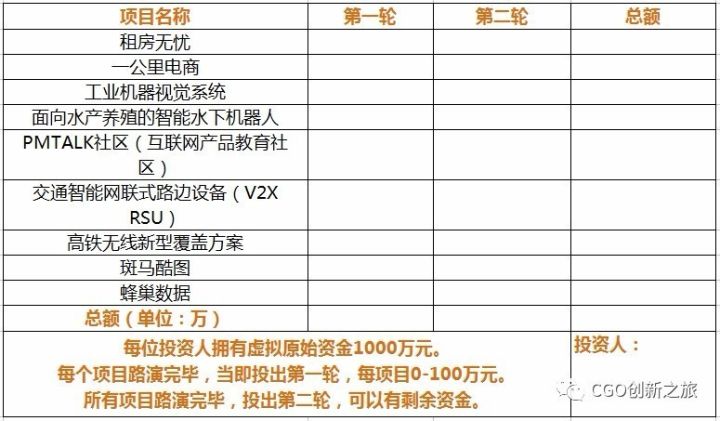 首先,主持人李华刚拿出一张幺蛾子的打分表:“鸡血表”。假设每位评委有1000万虚拟投资,在每个项目路演完毕,立即投出0-100万”资金;所有项目路演结束后,评委把剩下的资金自由地投给给心仪的项目。