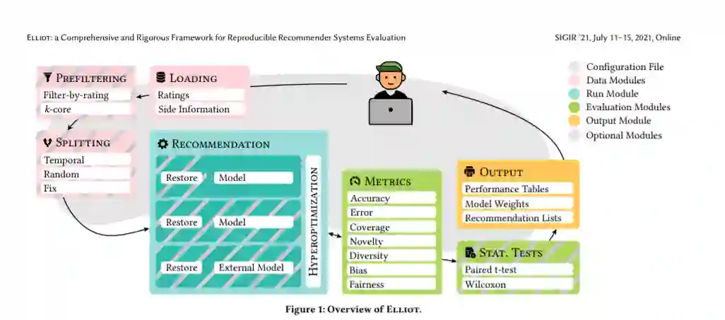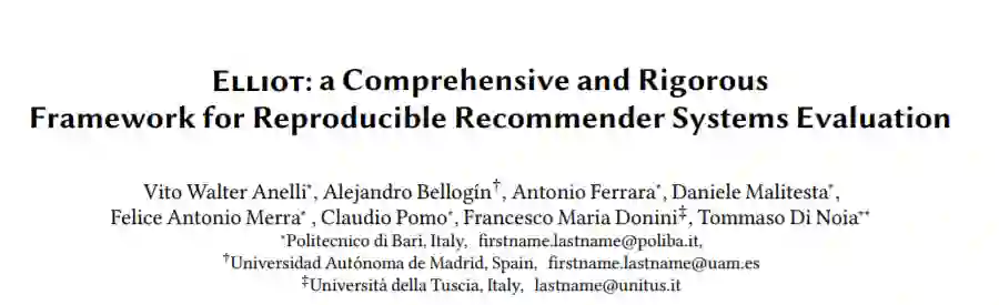 推荐系统已被证明是缓解过多选择问题和提供准确和量身定制的推荐的有效方法。然而,所提出的推荐算法、分割策略、评估协议、指标和任务的数量令人印象深刻,使得严格的实验评估尤其具有挑战性。由于对适当的评估基准、实验流程、超参数优化和评估程序的不断重建感到困惑和沮丧,我们开发了一个详尽的框架来满足这些需求。Elliot是一个全面的推荐框架,旨在通过处理一个简单的配置文件来运行和重现整个实验流程。该框架加载、过滤和分割数据需要考虑大量的策略(13种分割方法和8种过滤方法,从时间训练测试分割到嵌套的k -fold交叉验证)。Elliot为几种推荐算法(50)优化超参数(51个策略),选择最佳模型,将它们与提供模型内统计数据的基线进行比较,计算从准确性到准确度、偏差和公平性的度量(36),并进行统计分析(Wilcoxon和配对t检验)。其目的是为研究人员提供一种工具,以简化(并使其可重复)所有的实验评估阶段,从数据读取到结果收集。可以在GitHub (https://github.com/sisinflab/elliot)上找到Elliot。